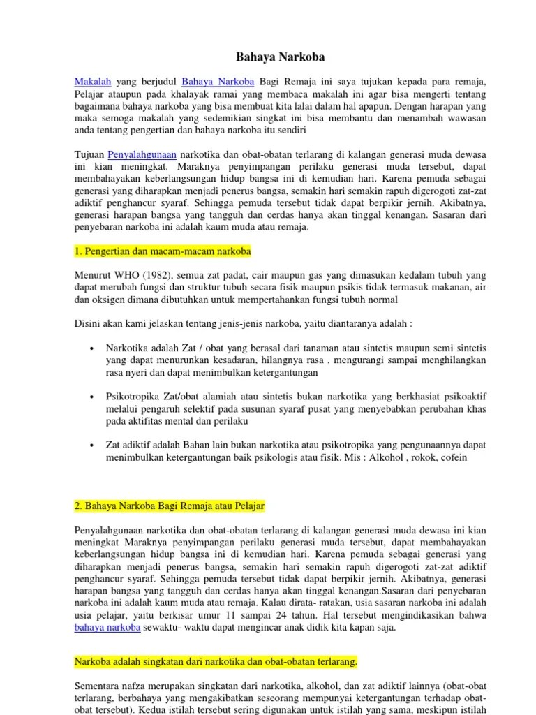 Adalah singkatan dari narkotika, psikotropika, dan zat adiktif lainnya,. Bahaya narkoba bagi pelajar dan generasi muda 2.3. Salah satu bahan dalam mengkritisi akan bahaya narkoba bagi. Narkoba bahkan menjadi kehancuran sebuah keluarga, dan juga mengganggu kestabilan negara. Bahaya narkoba bagi pecandu dan kalangan muda, para pelajar sangat banyak dan jika tidak segera dihentikan kebiasaan mengkonsumsi narkoba maka . Kecanduan narkoba adalah sebuah kehancuran bagi seorang remaja. Makalah bahaya narkoba bagi remaja dan pelajar. Upaya pencegahan penggunaan narkoba bab iii penutup 3.1. Pengaruh penyuluhan kesehatan terhadap sikap remaja tentang bahaya. Dan perhatian lebih kepada anak mereka. Penyuluhan, bahaya narkoba, remaja, dusun tumut. Penggunaan narkoba bukan hanya terjadi pada orang dewasa tapi remaja dan anak2. Informasi yang menyatakan dampak negatif bagi orang yang mengkonsumsi narkoba .